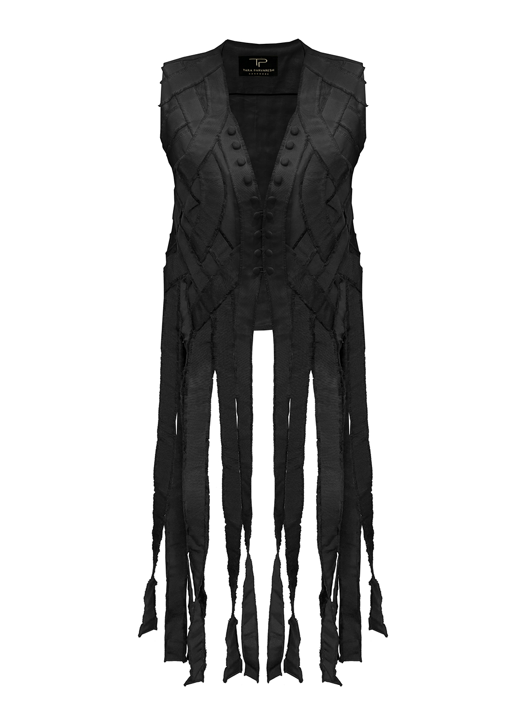 Each strip is individually hand‑crafted, with its texture formed entirely by hand, resulting in a rich, layered surface that reflects depth, movement, and artisanal precision. The interplay between the short, simple back and the expressive, extended front transforms the vest into a bold statement piece rooted in craftsmanship and contemporary design.