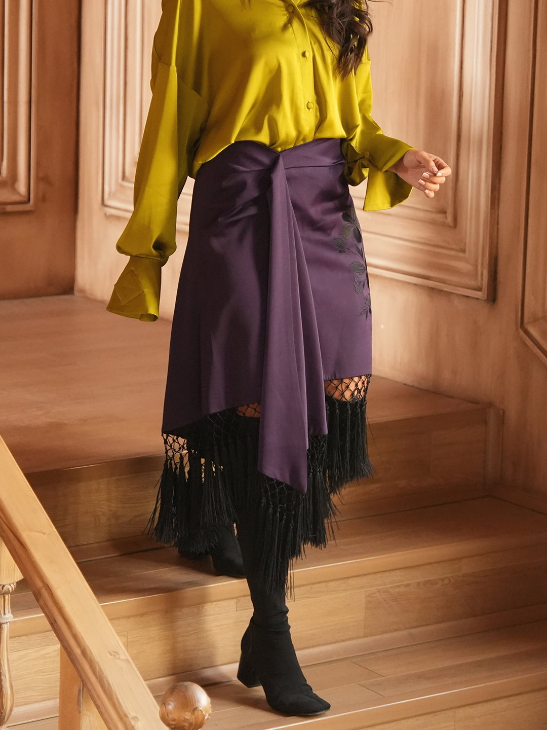 The Golru skirt is crafted from soft satin, featuring delicate fringe detailing along the hem and an elegant front drape reminiscent of a shawl. Intricate embroidery adorns the front, adding depth and artisanal character to the design. Fluid yet structured, this piece balances softness with refined craftsmanship, creating graceful movement and visual richness.