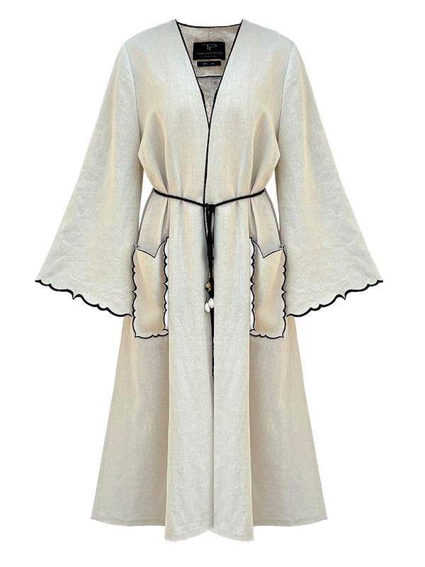 Elegant and versatile, Jalut is crafted with flowing lines and thoughtful details. The robe features front pockets with Mediterranean-inspired cuts, outlined in black embroidery for a striking finish. A twisted belt cinches the waist and is finished with handcrafted tassel ornaments, adding an artisanal touch of refinement. Designed to be worn as both a stylish outerwear piece for street looks and as a light robe for beachwear, it adapts effortlessly to any setting. Available in both short and long versions, and in four colors, Jalut offers elevated styling for every occasion