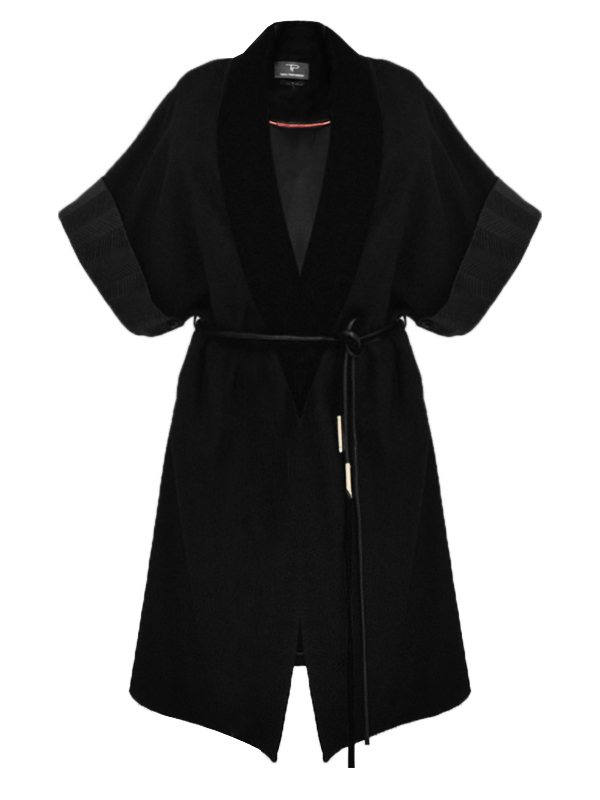 A classic wool robe featuring handmade stripe detailing on the sleeves, finished with a belt for effortless wear.