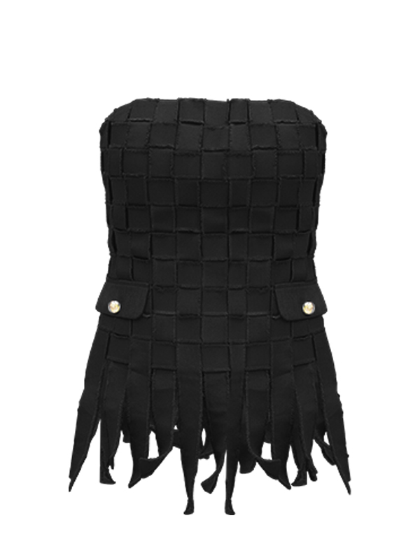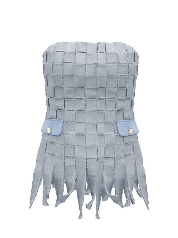 The Nasim Top is a showcase of craftsmanship, fully covered with hand‑woven fabric strips that create a striking textured finish. Designed to be worn as a set with the Nasim Skirt, it balances modern structure with artisanal detail. Available in black and gray‑blue, this piece offers versatility and elegance for both day and evening styling.