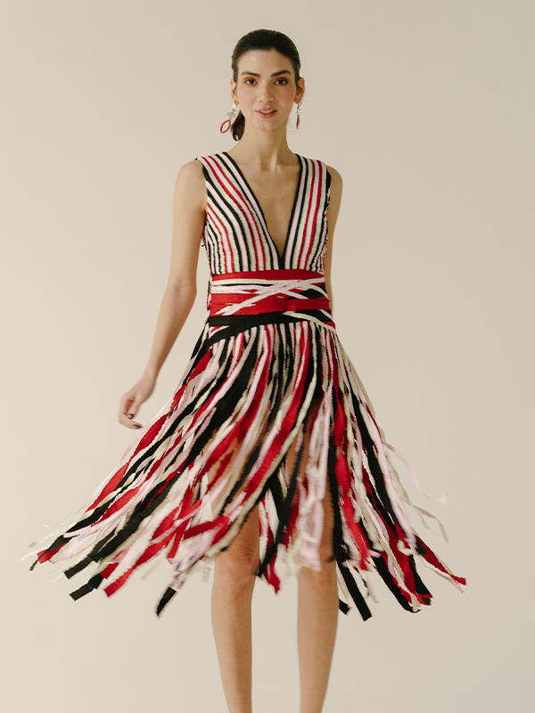 The Pasha Dress is a striking celebration of craftsmanship and bold design. Every strip of fabric in this piece is meticulously cut and hand-attached, creating a dynamic flow of movement with each step. Featuring three vibrant hues — red, black, and ivory — the dress radiates energy and elegance, while its deep V-neckline and high side slit add a modern, daring edge.