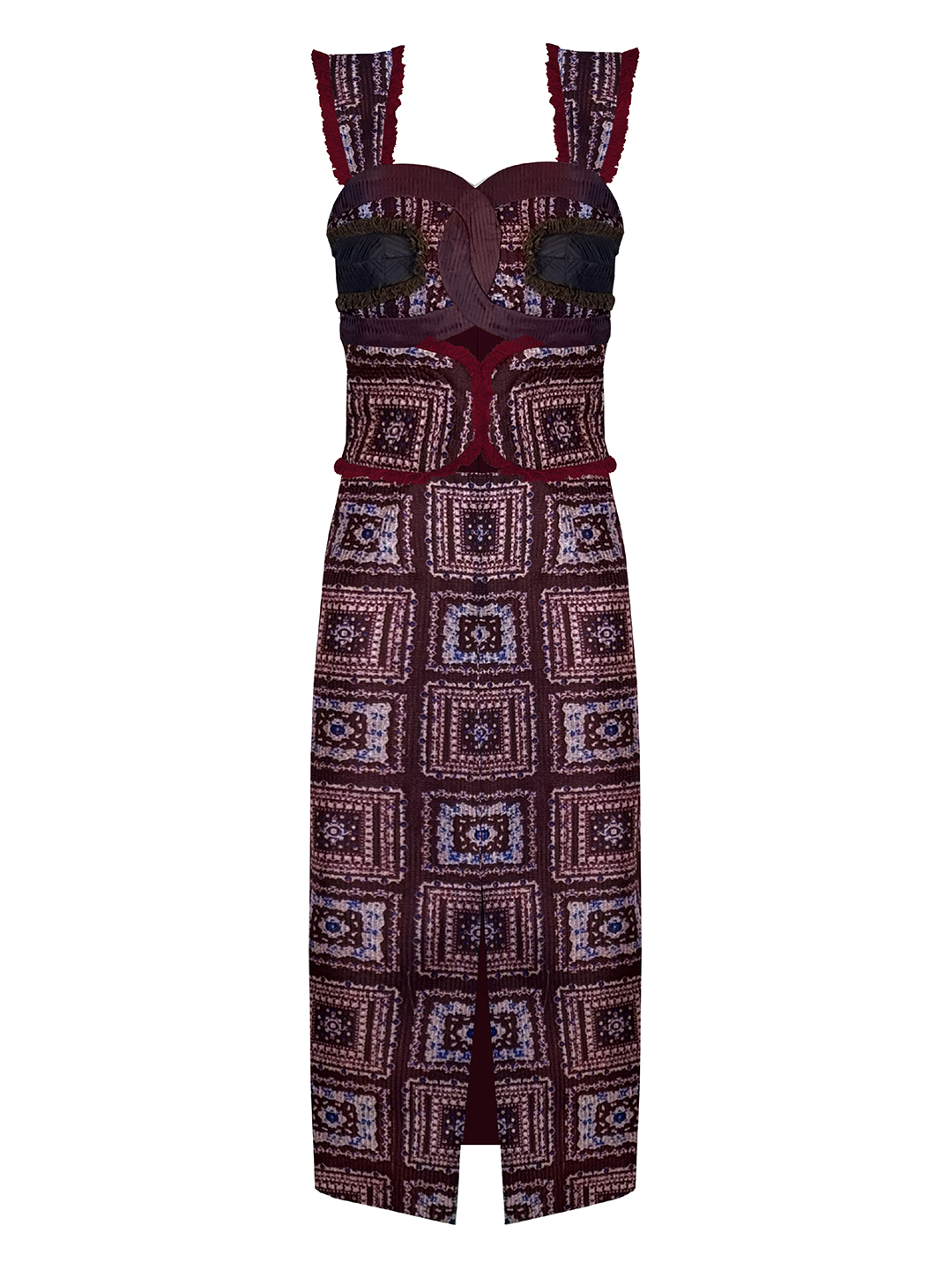 The Rita dress exudes timeless sophistication with its artisanal hand embroidery. The intricate mixed‑material, midi‑length design features elegant curved lines and geometric patterns adorning the bodice, creating a harmonious blend of artistry and style. Perfect for chic and elegant occasions, this midi dress is a stunning statement of refined craftsmanship.