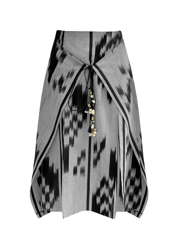 Inspired by femininity, the Zen skirt is a statement piece crafted entirely from handmade Darai fabric, woven using a traditional technique from Yazd, Iran. Two front slits add a bold, sensual edge, while tassels hanging from the waist ties create a flame‑like movement with every step. Designed to pair with the Nakhl Top, this set balances heritage craftsmanship with modern allure.